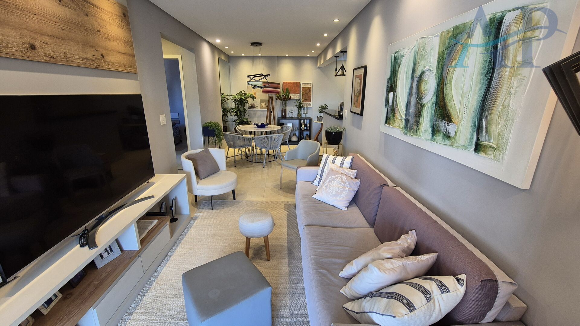 Imóvel semimobiliado, com dois dormitórios, sendo um deles suíte e com sacada privativa, sala para dois ambientes, varanda Gourmet com churrasqueira tradicional à carvão, cozinha com armários, área de serviço, área técnica para ar-condicionado e uma vaga de garagem.